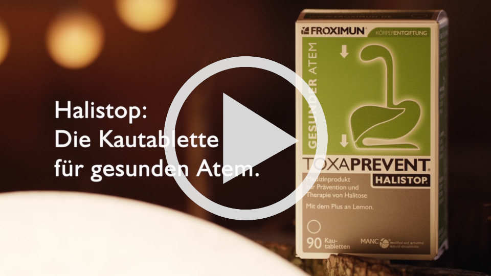 Innovation die schmeckt - Funktionalität mit Biss. Eine Kautablette auf dem Vormarsch, die ein nahes Beieinander wieder angenehm macht! TOXAPREVENT® HALISTOP® als Kautablette dient der natürlichen Regulation von Halitose (Mundgeruch) durch Bindung und Ausleitung ammoniumhaltiger Geruchsstoffe. In der Mundhöhle, besonders auf der Zunge und an entzündetem Zahnfleisch, werden geruchsaktive Substanzen gebunden und ausgeleitet. Durch die Reduktion von Histamin wird die Wundheilung entzündeter Stellen beschleunigt. Besonders durch den Einsatz von Stevia und Lemon verleiht es dem Produkt einen angenehmen Geschmack. Der Vorteil der süßen Komponente ist seine nicht kariogene Wirkung und seine Eignung für Diabetiker. Mit Zahnärzten entwickelt und von zufriedenen Anwendern empfohlen!
